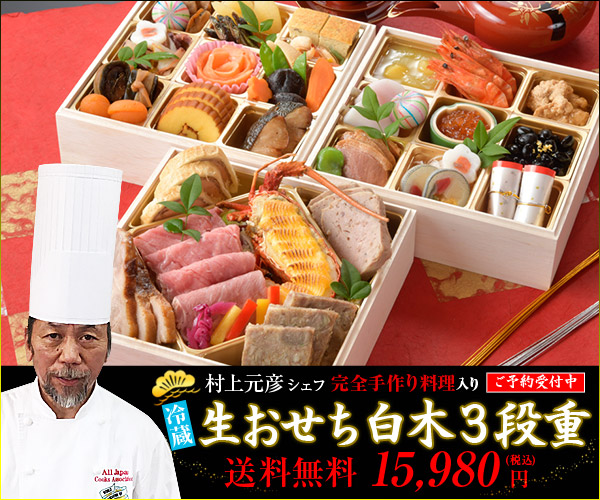 「生おせち料理 村上シェフ手作り重入3段重」は、冷凍ではなく“生”にこだわり、プロの料理人である村上シェフが手作りする料理を盛り込んだ贅沢な三段重です。